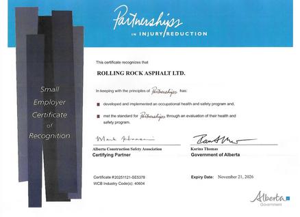 Rolling Rock Asphalt is committed to safety in the workplace and on the worksite. We have incorporated an extensive health, safety and environmental program as it is a fundamental and integral part of everyday business. Together our administration, shop and field staff ensures all areas of the company are implementing this program, keeping our work sites safe for the public, our client’s employees and our employees. We strive for zero accidents and incidents by providing continuous improvement through communication, internal and external training programs, and encouraging a safety first attitude. Our program requires our employees to observe and act through hazard assessment, risk analysis and documentation for a well-rounded safety environment. A successful maintenance program keeps our tools and equipment in exceptional working order. Building together, we will make every effort to ensure that when each employee leaves their job with us at the end of the day and returns home, they do so just as healthy and safe as when they arrived. This is the essence of a true safety culture that is part of Rolling Rock Asphalt.
